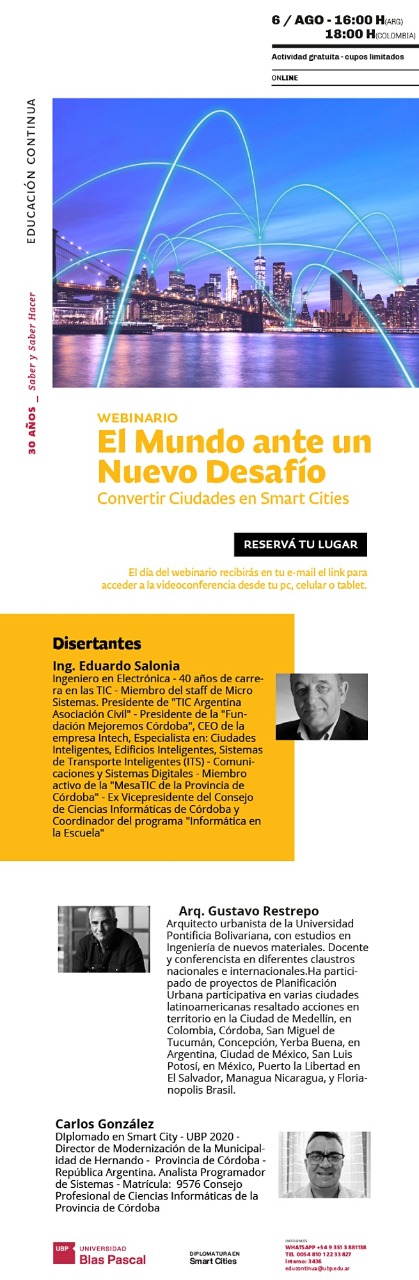 El próximo jueves 6 de agosto la Secretaría de Posgrado y Educación Continua de la Universidad Blas Pascal (UBP) realizará el webinar gratuito ‘El mundo ante un nuevo desafío: Convertir Ciudades en Smart Cities’. La participación en el evento requiere inscripción previa y los cupos son limitados.