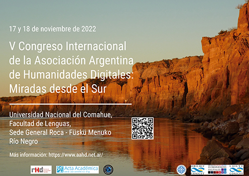 El 17 y 18 de noviembre de 2022 la Asociación Argentina de Humanidades Digitales (AAHD) y la Facultad de Letras (FadeL) de la Universidad Nacional del Comahue (UNCo), Sede General Roca (ciudad de General Roca/Füskü Menuko, provincia de Río Negro – Argentina) realizarán en modalidad presencial el 5° Congreso Internacional ‘Humanidades Digitales: Miradas desde el Sur’.