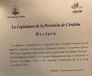La Legislatura de Córdoba manifestó su adhesión y beneplácito en relación al 1° Congreso Internacional de Ingeniería Aplicada a la Innovación y Educación y la Asamblea General ISTEC 2019, organizados por el Consorcio Iberoamericano para la Educación en Ciencia y Tecnología (ISTEC), UTN – Facultad Regional Córdoba y TIC Argentina.