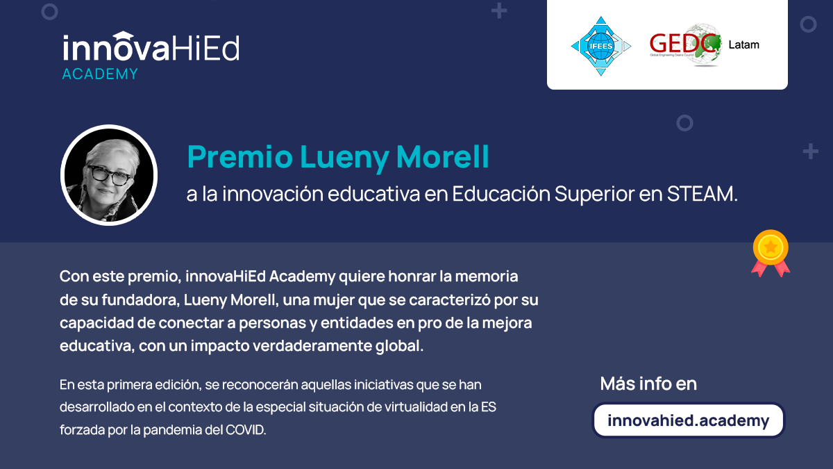 Con este premio, innovaHiEd Academy quiere honrar la memoria de su fundadora, Lueny Morell, una mujer que se caracterizó por su capacidad de conectar a personas y entidades en pro de la mejora educativa, con un impacto verdaderamente global.